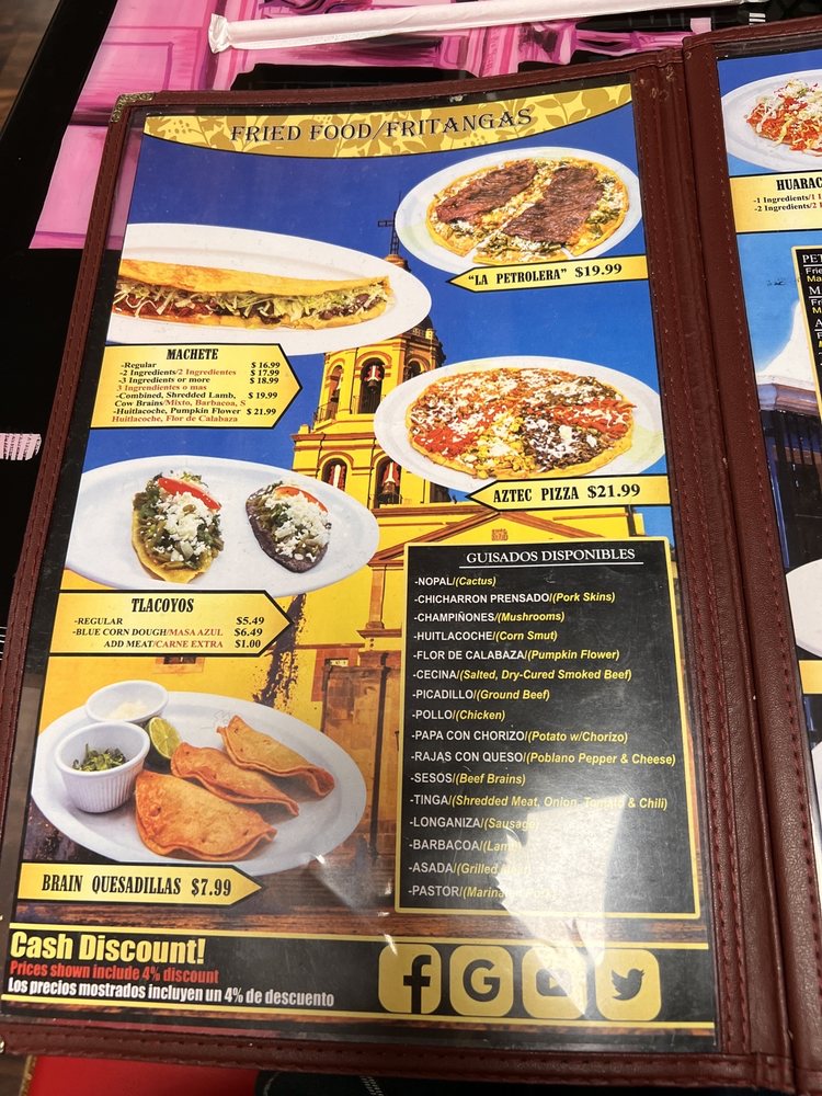 The menu showcases a variety of innovative dishes such as the Machetes, an 18" handmade corn masa quesadilla filled with cheese and your choice of ingredients, and the delightful Los Gigantes, featuring a hearty homemade corn masa shell topped with eggs and meat of your choice. Diners rave about the Aztec Pizza, perfect for sharing, with its unique toppings like nopales and pumpkin flowers.