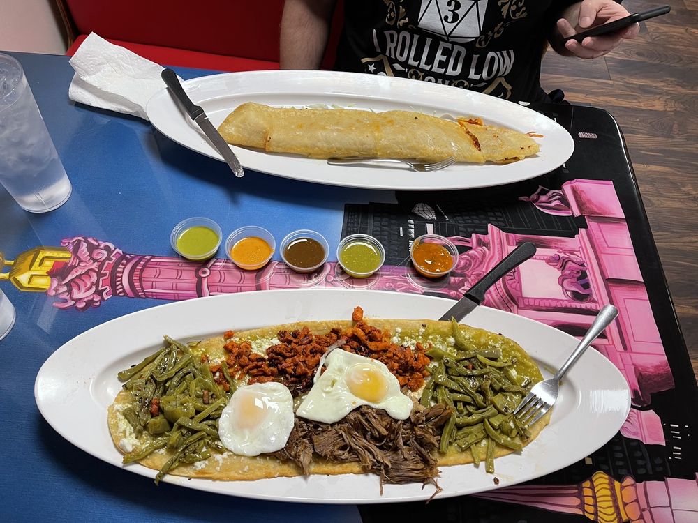 Tortilla gruesa de maz de 16 pulgadas, salsa roja, salsa verde, dos huevos, nopalitos y una carne de su preferencia. / 18-inch homemade corn-masa shell, red sauce, green sauce two eggs, prickly pear cactus, meat of your choice.