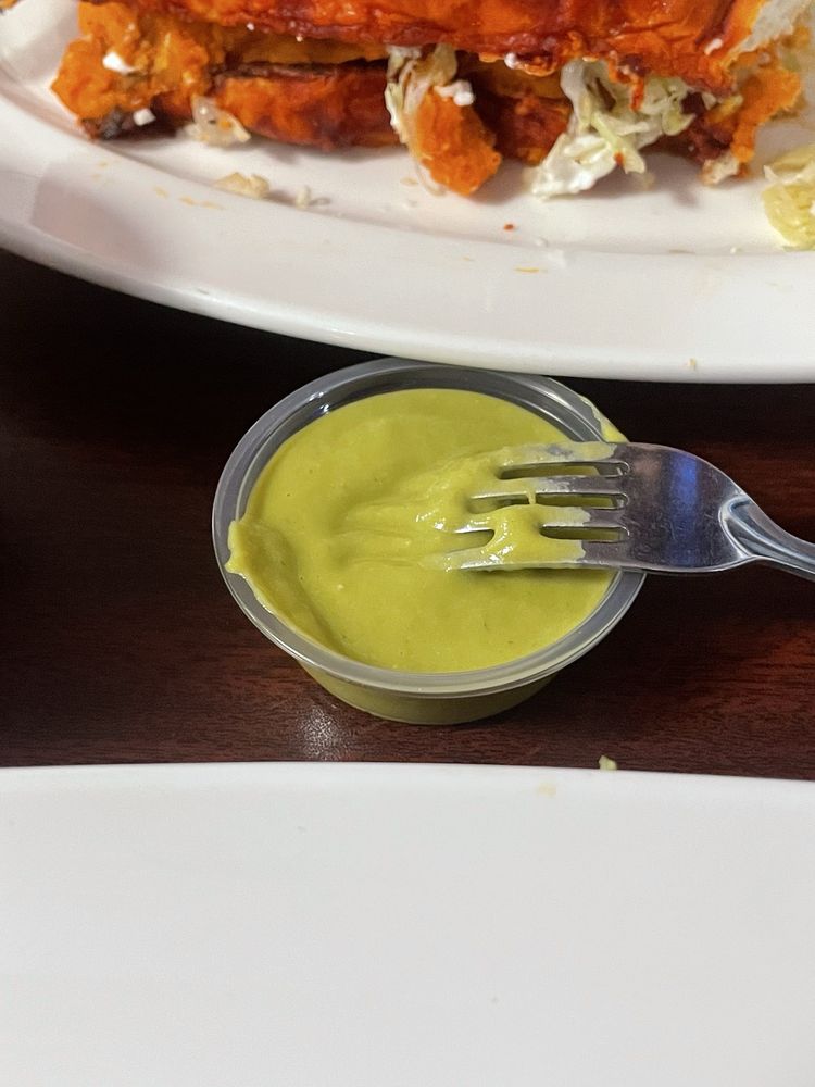 Tradicional pan blanco en salsa de chile guajillo doradito a la perfeccin relleno de papas con chorizo, crema, queso fresco y lechuga. / (Torta style) Traditional white bread dipped in red guajiro pepper sauce, lightly pan fry, filled with potatoes and chorizo, sour cream, queso fresco and lettuce.
